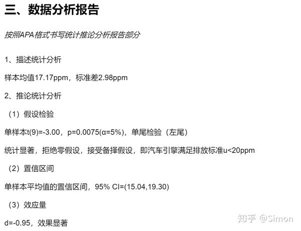 采用APA格式,需要报告检验类型、抽样分布类型、检验方向、检验统计量、p值、显著性水平α;