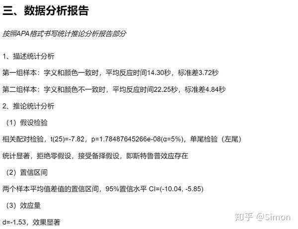 根据美国心理学会APA给出的统计推论分析结果报告格式,该案例最终的数据分析报告如下: