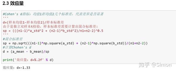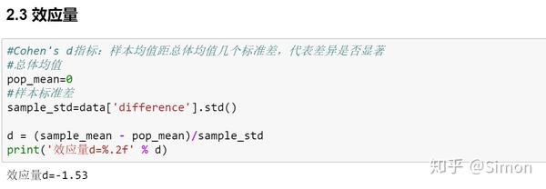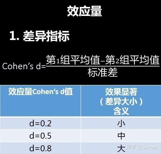 ①差异度量Cohen's d = (样本均值1-样本均值2)/标准差