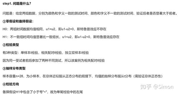 问题:验证斯特鲁普效应的存在(不一致组反应时间均值比一致组反应时间均值长)