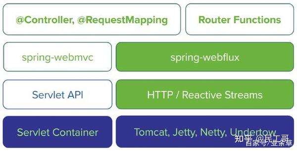 在Web容器的选择上,Spring WebFlux既支持像Tomcat,Jetty这样的的传统容器(前提是支持Servlet 3.1 Non-Blocking IO API),又支持像Netty,Undertow那样的异步容器。不管是何种容器,Spring WebFlux都会将其输入输出流适配成Flux<DataBuffer>格式,以便进行统一处理。