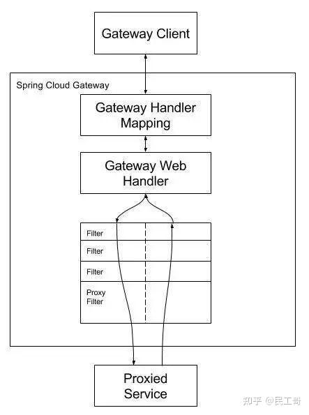 客户端向 Spring Cloud Gateway 发出请求。然后在 Gateway Handler Mapping 中找到与请求相匹配的路由,将其发送到 Gateway Web Handler。Handler 再通过指 定的过滤器链来将请求发送到我们实际的服务执行业务逻辑,然后返回。过滤器之间用虚线分开是因为过滤器可能会在发送代理请求之前(“pre”)或之后(“post”)执行业务逻辑。