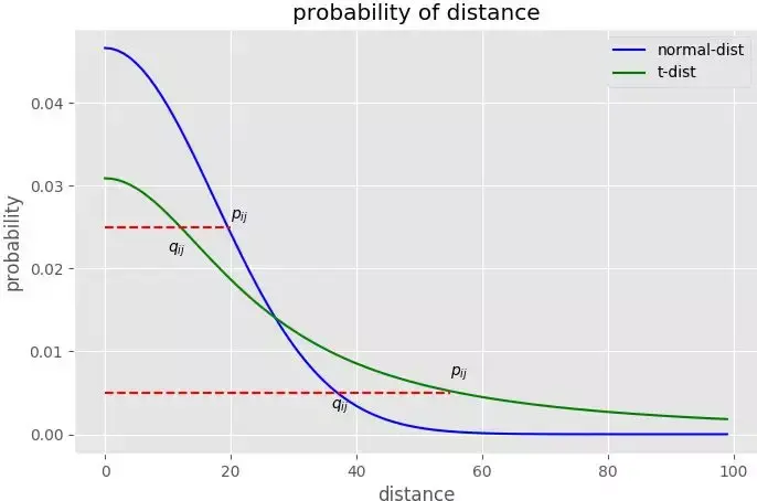 我们在低维空间的分布中,把原先用的高斯分布改成自由度为1的分布(把尾巴抬高)。下图可以很好地说明为什么“把尾巴抬高”可以很好地缓解拥挤问题。绘图代码参考 [11]