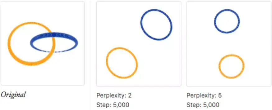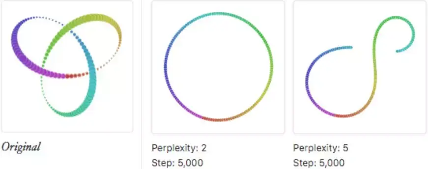 日常使用t-SNE可调的参数基本只有困惑度,非常简单。针对困惑度如何影响可视化结果,文献[17]做了非常详细的展示,还包含一个在线程序可以辅助认识。