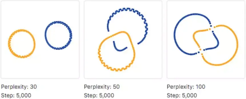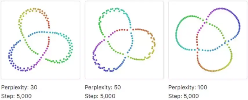 困惑度大致表示如何在局部或者全局位面上平衡关注点,再说的具体一点就是关于对每个点周围邻居数量猜测。困惑度对最终成图有着复杂的影响。