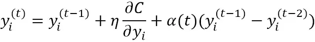 带动量的梯度更新公式:(这里给出单个y_i点的梯度下降公式,显然需要对所有:Y^(T)={y_1,y_2,...,y_n}进行统一迭代。)