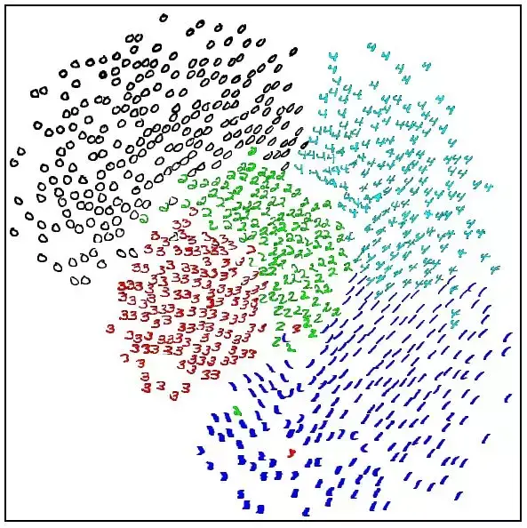 可以对比一下采用t-SNE对MNIST数据集的降维可视化效果:
