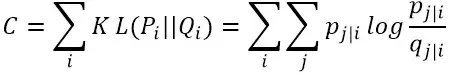 SNE的目标是让低维分布去拟合高维分布,则目标是令两个分布一致。两个分布的一致程度可以使用相对熵(Mutual entropy,也叫做KL散度,Kullback-Leibler divergences,KLD)来衡量,可以以此定义代价函数(cost function):