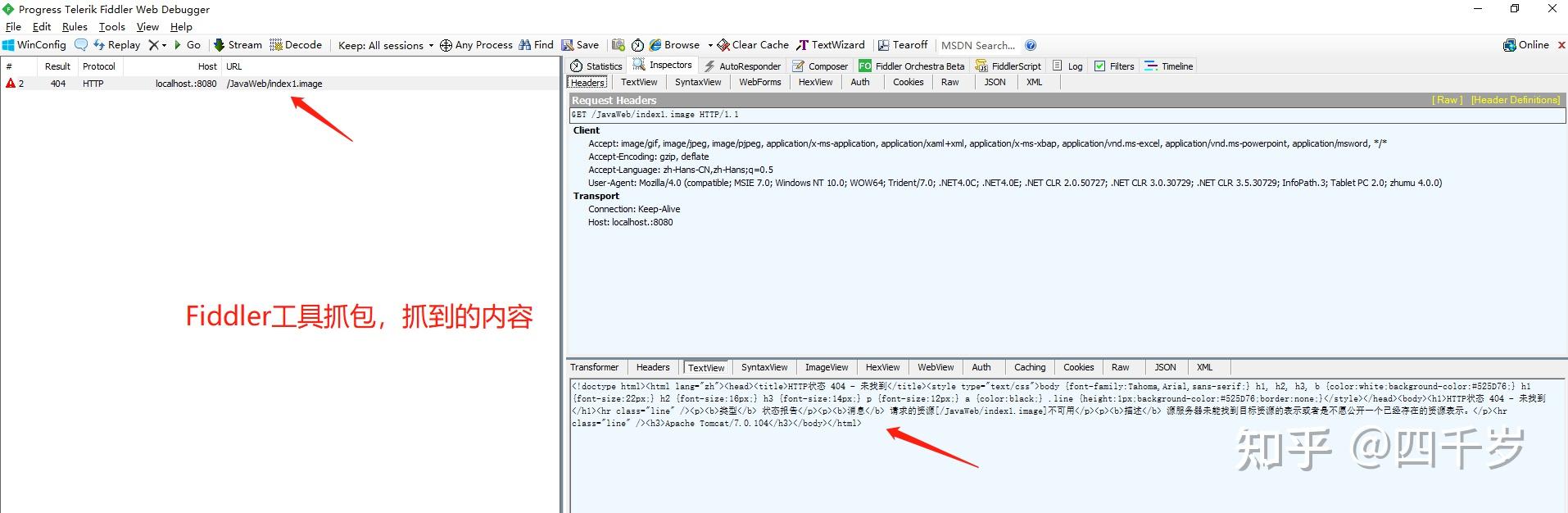 可以看到tomcat给浏览器返回了一个404页面,并且这个页面的文字是中文的,看起来好像还有css样式。这个404的html页面是谁返回的?我们用 Fiddler工具 抓包看一下Tomcat返回给浏览器的到底是什么东西?