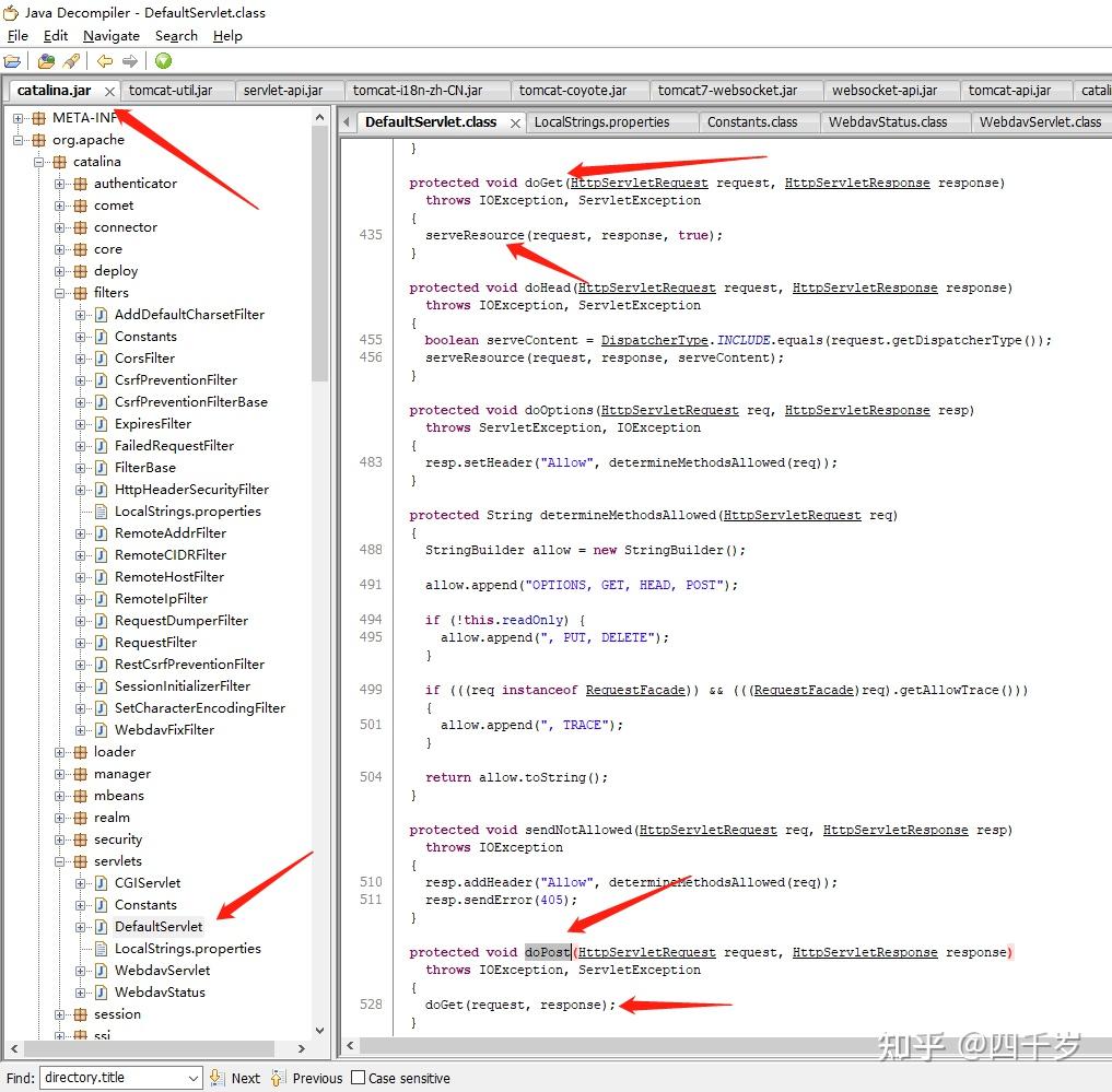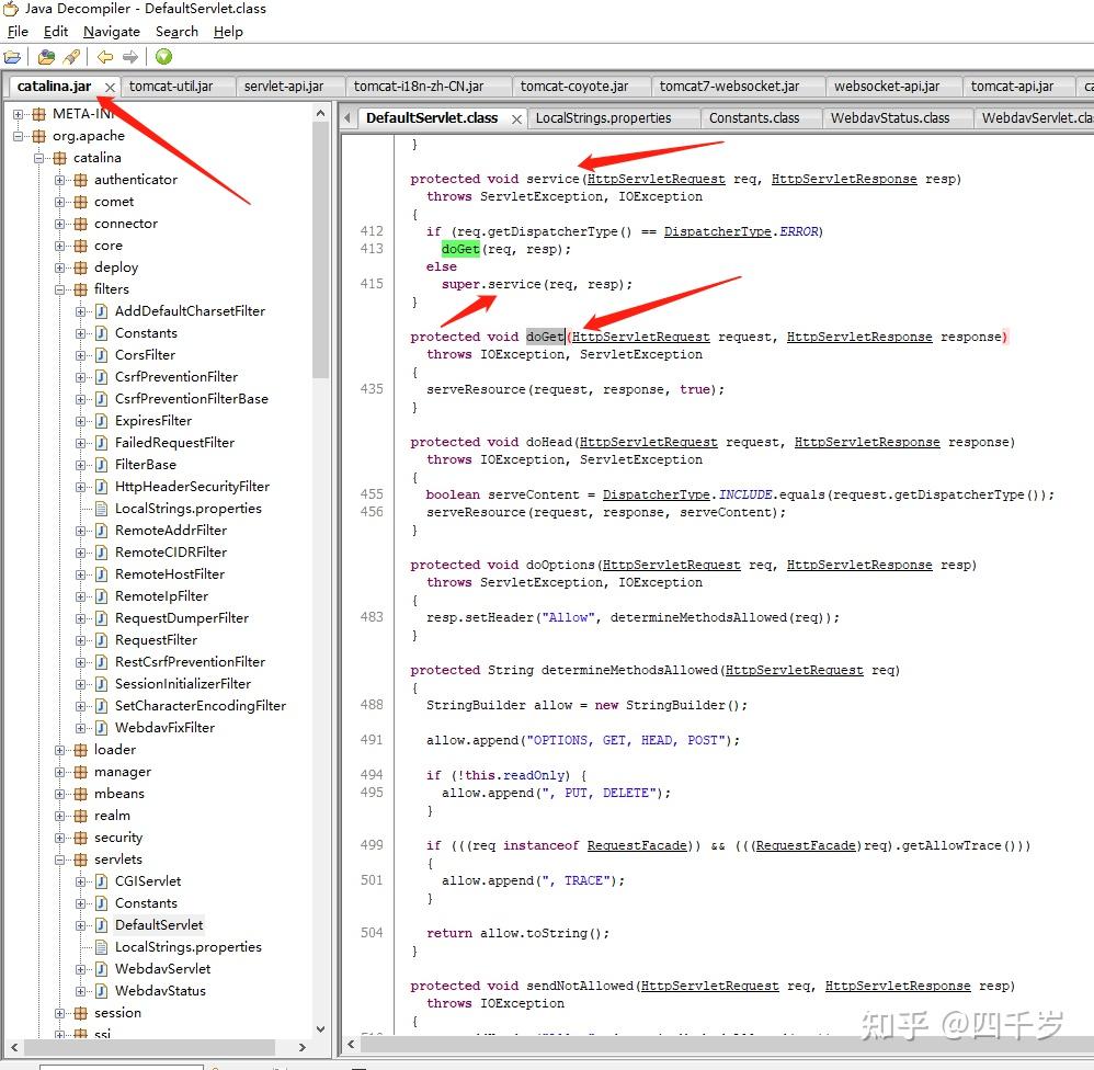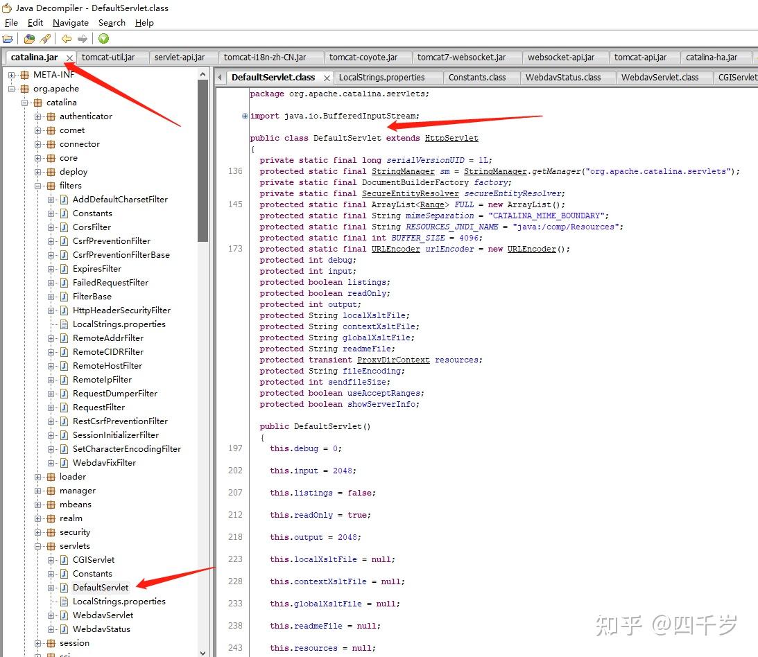我们从DefaultServlet的完整包名 org.apache.catalina.servlets.DefaultServlet 猜测这个类应该在 catalina.jar 这个jar包里面。使用 jd-gui 反编译工具看一下 catalina.jar 包里面的代码: