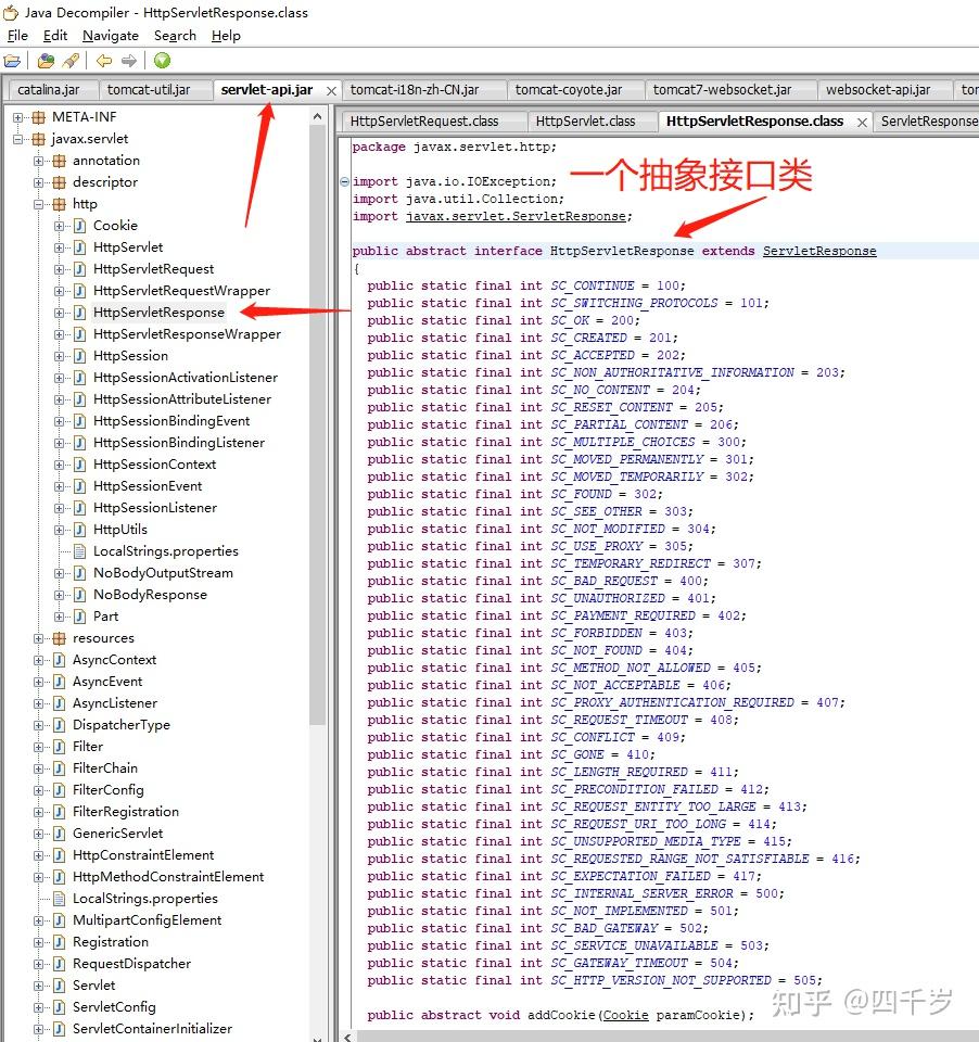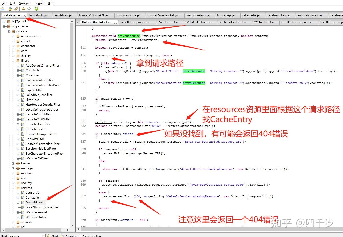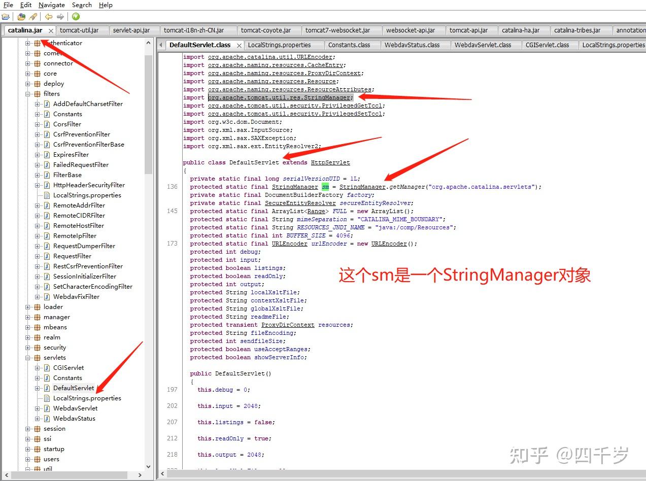 我们从DefaultServlet的完整包名 org.apache.catalina.servlets.DefaultServlet 猜测这个类应该在 catalina.jar 这个jar包里面。使用 jd-gui 反编译工具看一下 catalina.jar 包里面的代码: