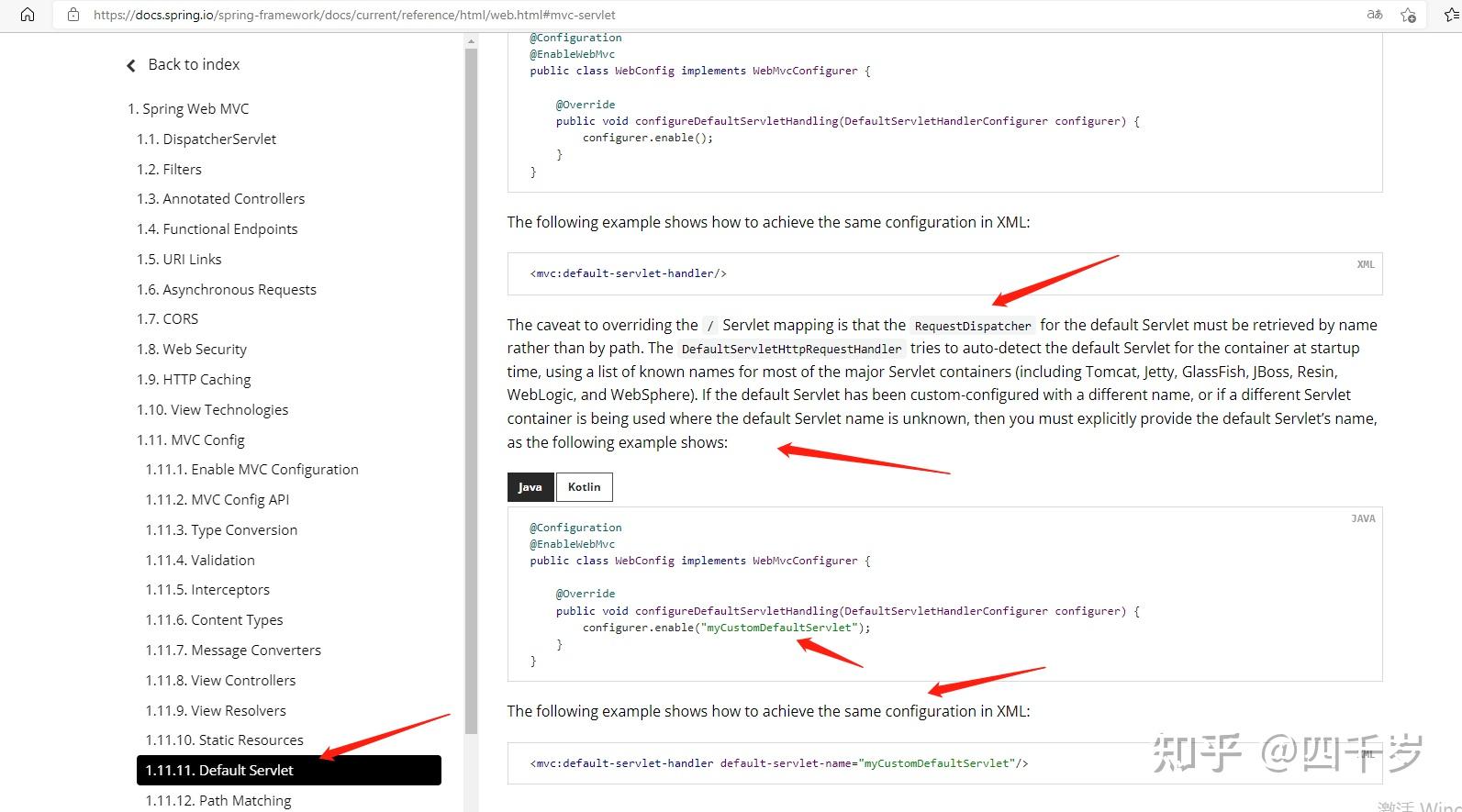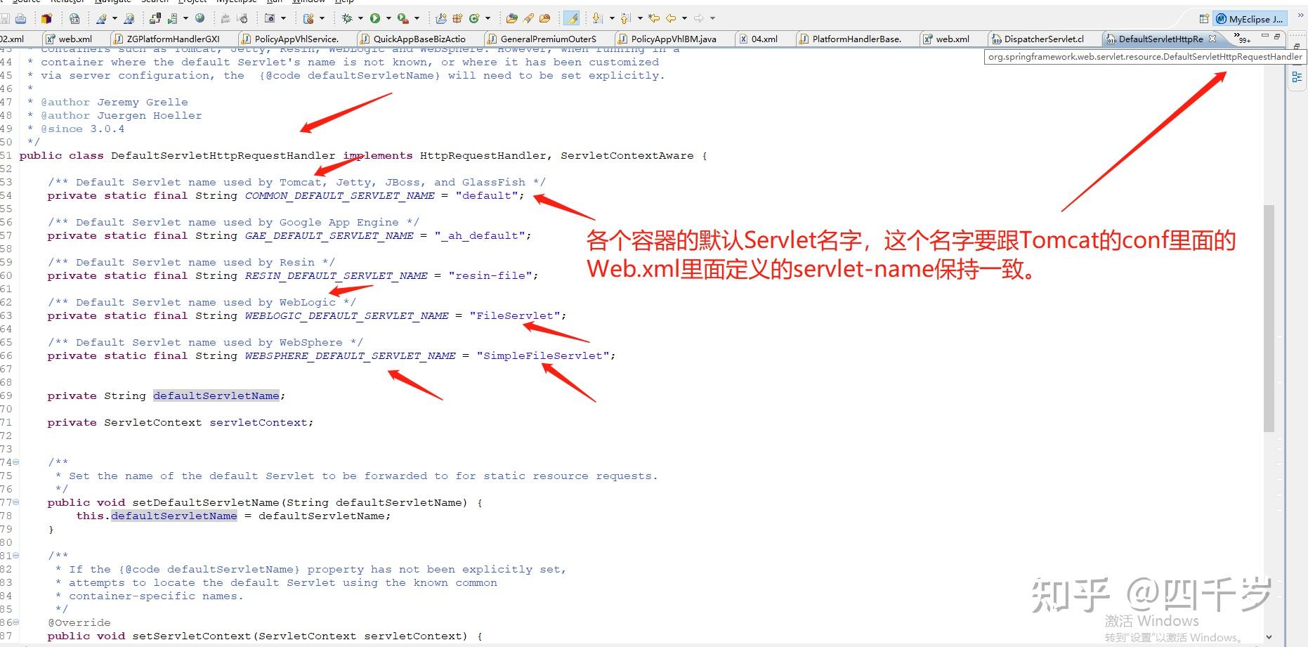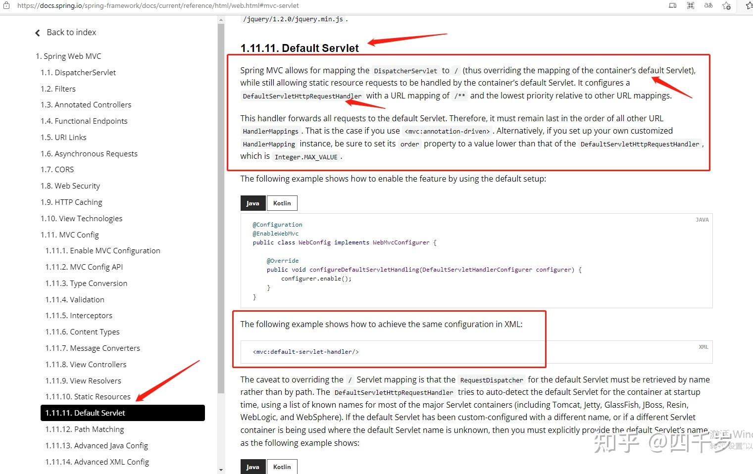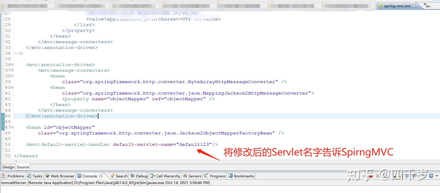 这段英文的意思是:SpringMVC获取Web容器中的默认Servlet的时候,是依赖Web容器中默认的名字去找的,不是依赖类路径去找的。DefaultServletHttpRequestHandler会尝试按照默认的名字去Web容器中找,主流的Web容器有这几个(Tomcat, Jetty, GlassFish, JBoss, Resin, WebLogic, and WebSphere)。如果你修改了Web容器中默认的Servlet名字,你必须主动告诉SpringMVC,像下面这样。