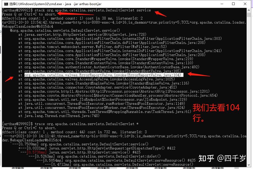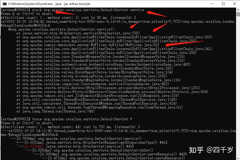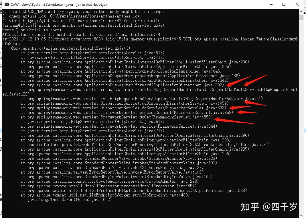 Arthas的stack命令可以 输出当前方法被调用的调用路径 ,我们可以使用这个命令看看当发生404错误的时候,是谁在调用DefaultServlet类的service方法? 执行这个命令: stack org.apache.catalina.servlets.DefaultServlet service