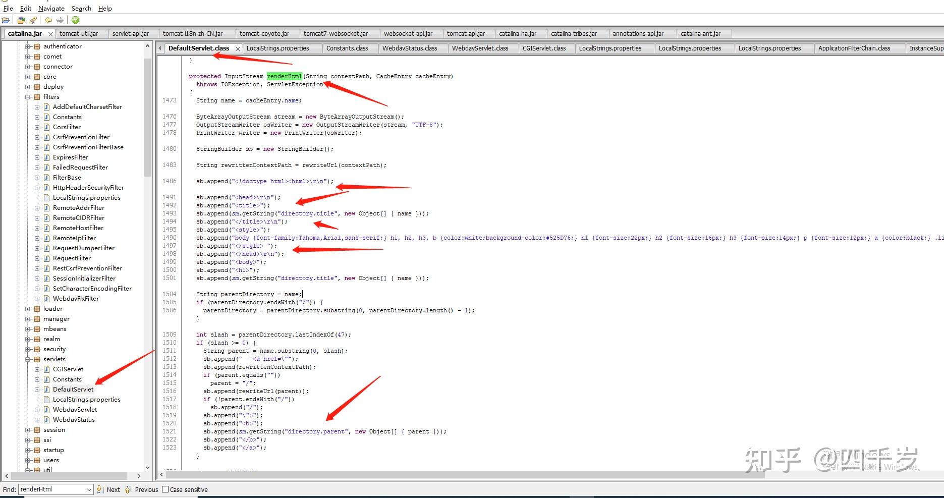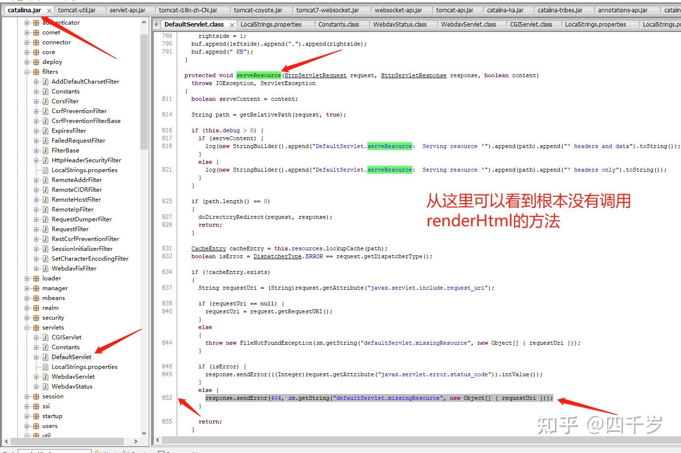 看到这里,我们只找到了404页面上的一部分中文数据,那剩下的中文都是在哪里传过去的呢?还有404的html代码DefaultServlet是在哪里返回的?还有这个404到底是不是在serveResource方法返回的,我们也不确定。因为我们只是看源码看到了有404这个错误,但实际上代码到底走不走这里我们都不确定。 如果你往下看DefaultServlet的源码,你会发现renderHtml这个方法。但是renderHtml这个方法跟404的html页面没有任何关系。