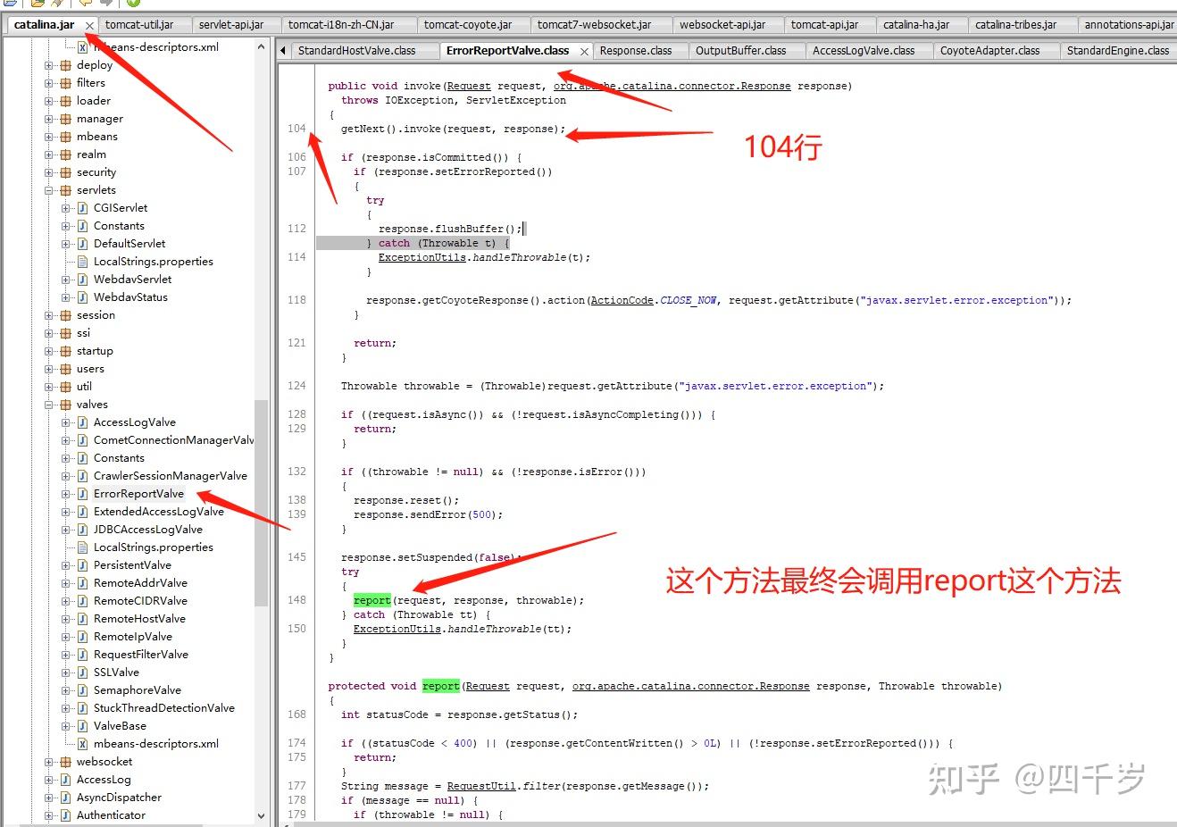 根据搜索结果我们发现了一个比较熟悉的类就是 org.apache.catalina.valves.ErrorReportValve.java 。这个类我们在stack org.apache.catalina.servlets.DefaultServlet service这个命令的结果里面看到过。这个类在调用DefaultServlet类的service方法的调用路径上面有。赶紧去看看ErrorReportValve.java的源码。