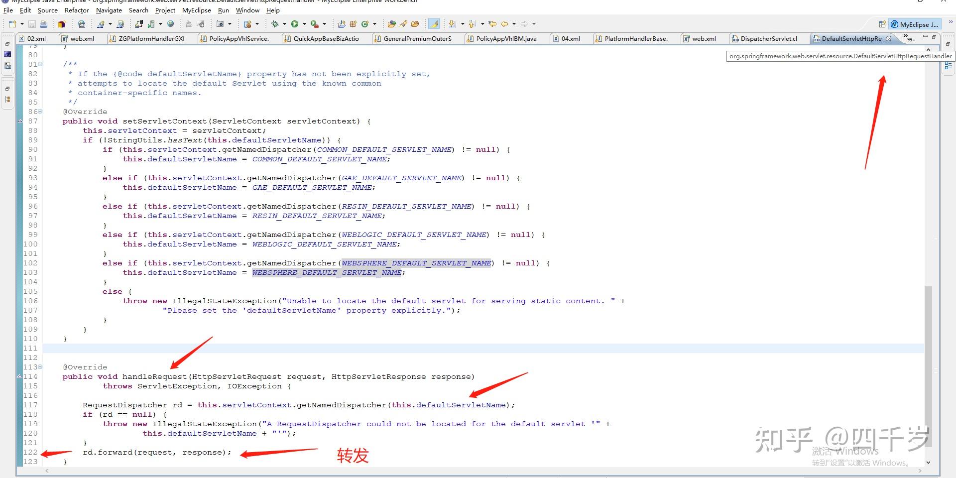 在DefaultServletHttpRequestHandler源码这里可以看到,SpringMVC将请求转发给Web容器的默认Servlet了。