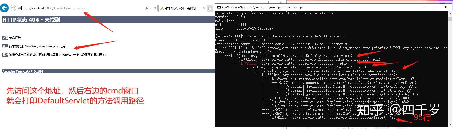 刚好,之前我看过阿里巴巴公司开源的神器 Arthas ,利用这个工具可以追踪一下当发生404的时候DefaultServlet类有没有被调用?如果调用了,调用了DefaultServlet类的哪些方法?