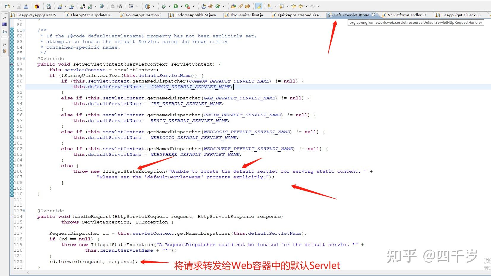 从上图可以看到(从下往上看),发生404的时候,SpringMVC的调用栈如下: at org.springframework.web.servlet.FrameworkServlet.service(FrameworkServlet.java:844) 接下来 at org.springframework.web.servlet.FrameworkServlet.doGet(FrameworkServlet.java:859) 接下来 at org.springframework.web.servlet.FrameworkServlet.processRequest(FrameworkServlet.java:968) 接下来 at org.springframework.web.servlet.DispatcherServlet.doService(DispatcherServlet.java:893) 接下来 at org.springframework.web.servlet.DispatcherServlet.doDispatch(DispatcherServlet.java:959 接下来 at org.springframework.web.servlet.mvc.HttpRequestHandlerAdapter.handle(HttpRequestHandlerAdapter.java:51) 接下来 at org.springframework.web.servlet.resource.DefaultServletHttpRequestHandler.handleRequest(DefaultServletHttpRequestHandler.java:122) 终于看到 DefaultServletHttpRequestHandler 这个类了,我们来看下 DefaultServletHttpRequestHandler 的源码,如下截图: