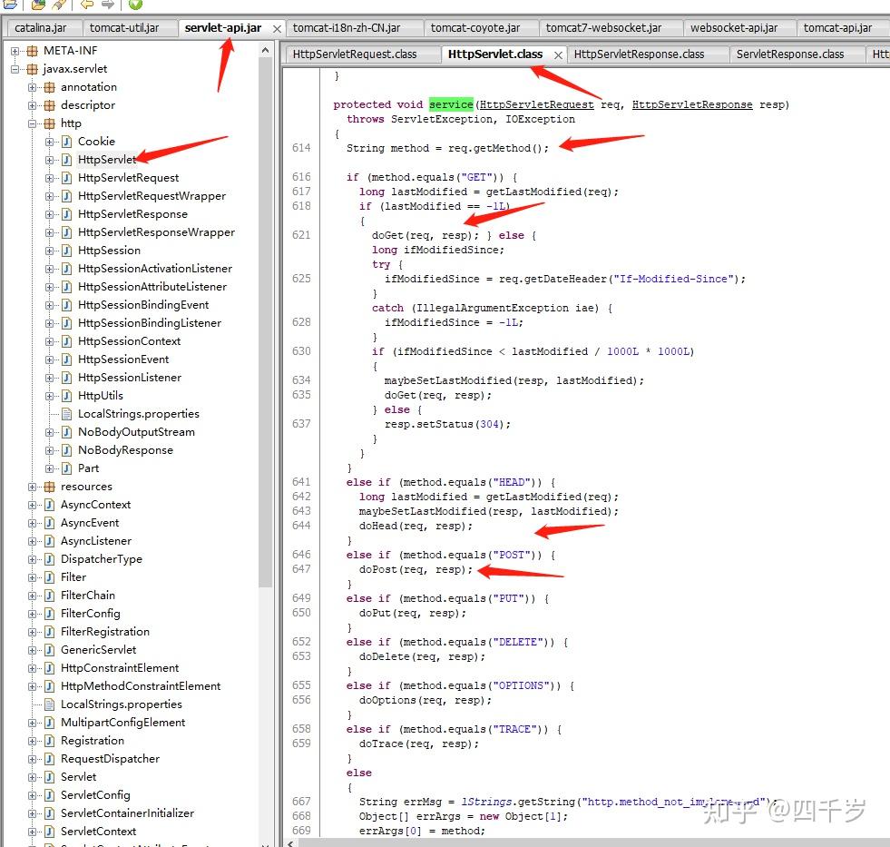 看懂了没?当然我们也可以在自己的Servlet类里面重写这个service方法,此时当一个请求被我们的servlet处理的时候,我们自己的Servlet类的service方法就会被Tomcat通过反射被调用,你可以直接在service方法里面写相关的业务代码。也可以在service方法里面根据条件去决定调用doGet或者doPost方法。