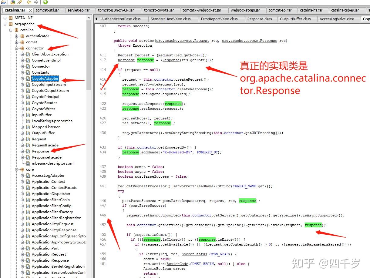 现在可以确定当发生404错误的时候,是由DefaultServlet类中的serveResource方法的第852行通过HttpServletResponse的sendError方法返回出去的。但是404的html代码是在哪返回出去的还是没找到。我们上面看过HttpServletResponse的源码,知道HttpServletResponse是一个抽象接口类,那404的html源码是不是在HttpServletResponse的实现类中返回的呢?我们需要想办法找到调用DefaultServlet类的service方法的地方,看看它调用DefaultServlet类的service方法传的HttpServletResponse实现类到底是什么?