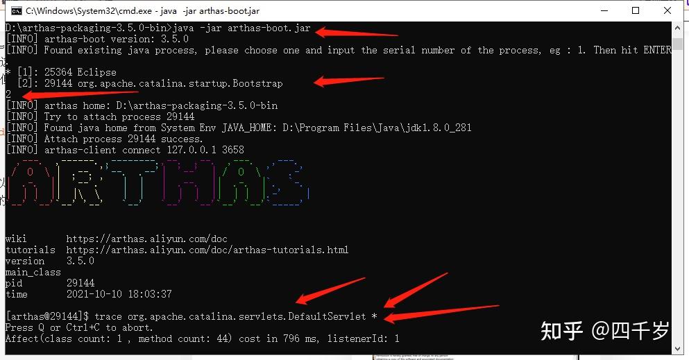 使用这个命令可以监控DefaultServlet这个类的所有方法,并且打印方法的调用路径。看下Arthas的官方文档怎么说。