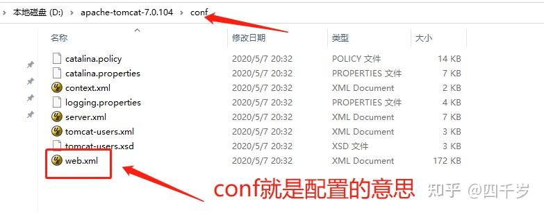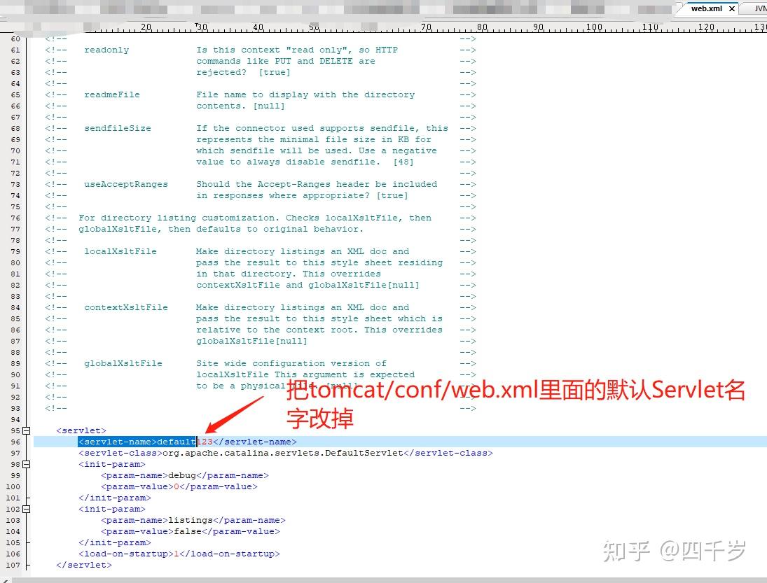 我们来试一下,我们把Web容器中默认的Servlet名字改掉,然后不告诉SpringMVC的话,会发生什么情况。 首先去Tomcat的安装目录conf下面打开web.xml将默认的Servlet名字改掉。