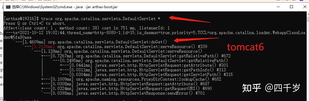启动Arthas并监控tomcat的JVM进程,然后执行这个命令: trace org.apache.catalina.servlets.DefaultServlet *