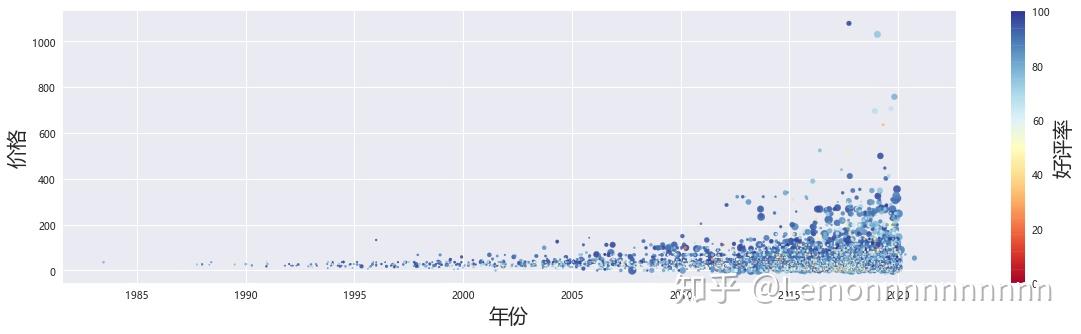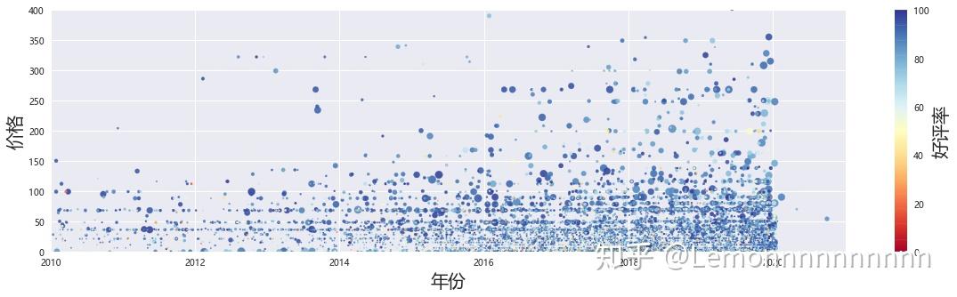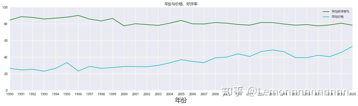 接下来以年分组进行平均价格和平均好评率的计算绘入图中,