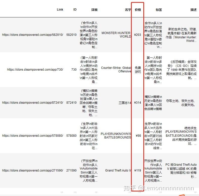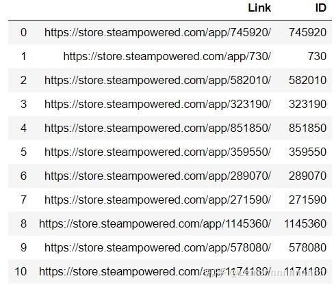 主要就提取游戏的链接和ID,转成dataframe然后保存。steam每个游戏都有自己的ID,比如csgo的链接是 store.steampowered.com/app/730/CounterStrike_Global_Offensive/