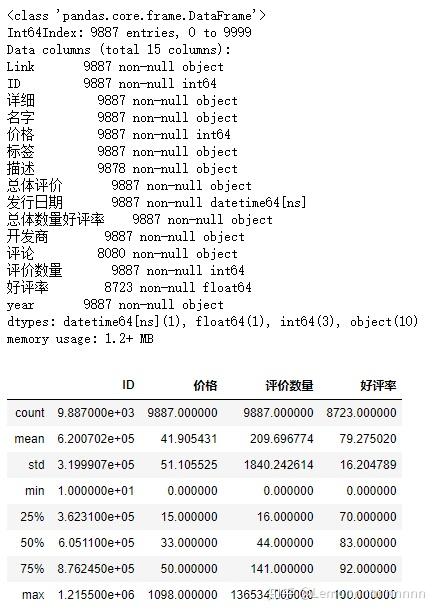 看一下整体情况,这里我爬了一万条,但是有些未在国区发售,去除掉之后还剩9887条。