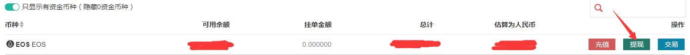 找到EOS的这一行点击提现(我们这里以eos举例,你想提什么币就在币所在的那行点击绿色的提现)