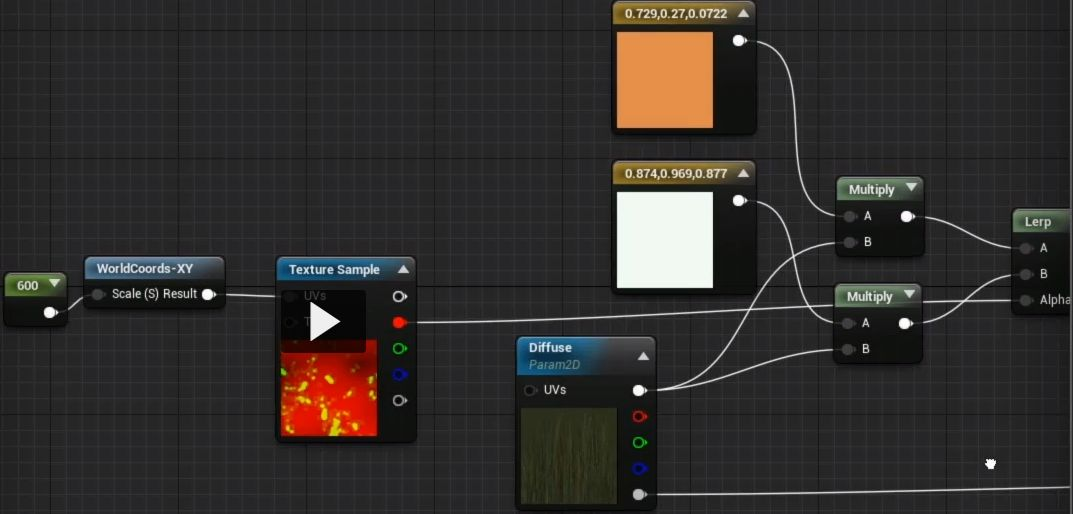 - 通过函数 WorldCoords-XY 把一遮罩图作为Alpha lerp上不同颜色作为世界投射覆层,给一大片草叠加上颜色变化。