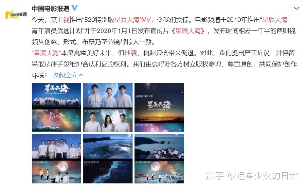 电影评道直接点名批评,发博怒斥,“星辰大海青年演员优选计划”宣传片,两个视频从创意、形式、布景乃至分镜都惊人一致,最后说道:“星辰大海”本是寓意美好未来,但抄袭、复制只会带来倒退。