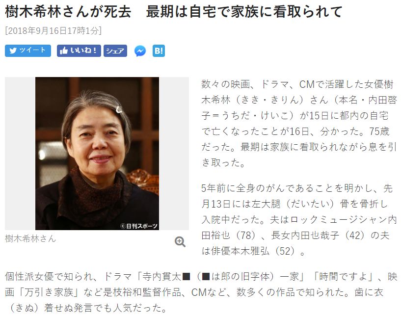 当时日本报纸写树木希林,标题直接用的是