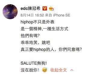 其实,节目开播最初的时候,mc热狗在微博上写到“你们准备好了吗?这只是一个开始,嘻哈风暴真的要来了。”