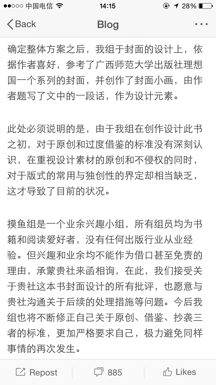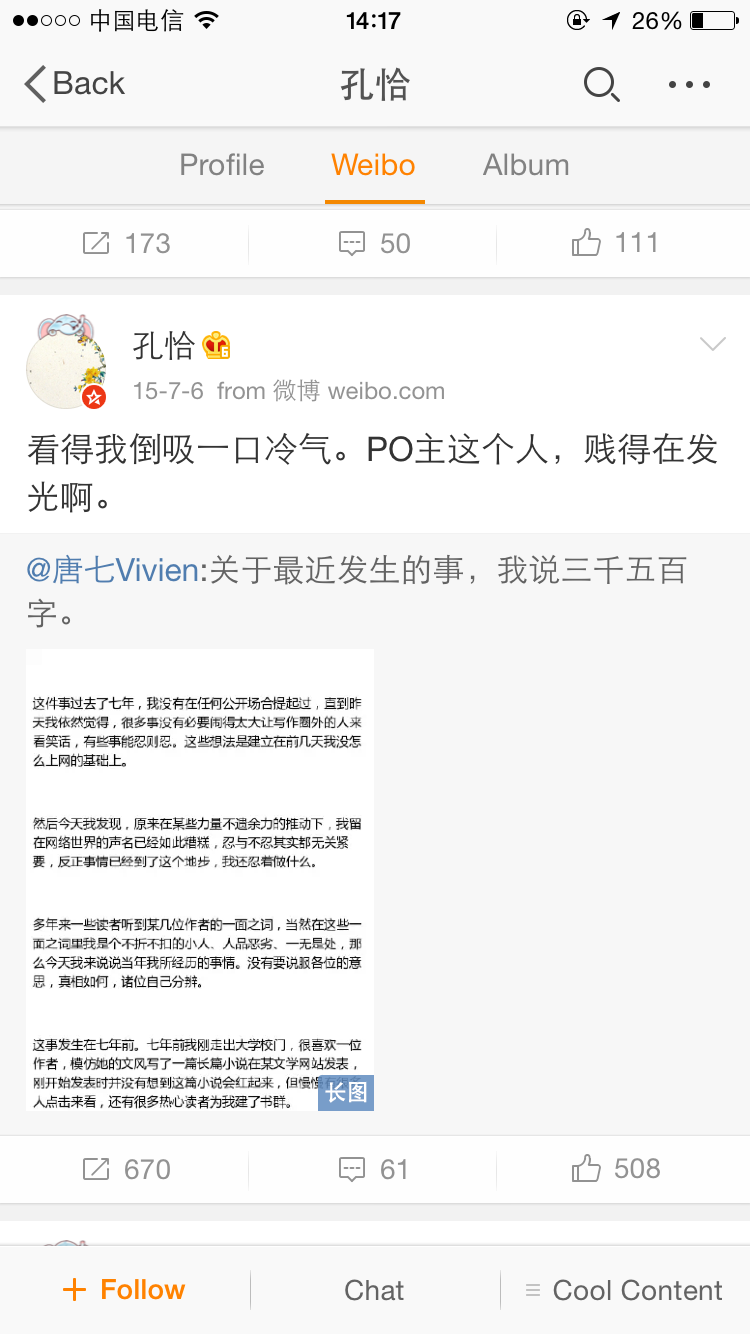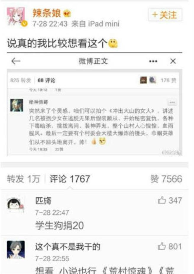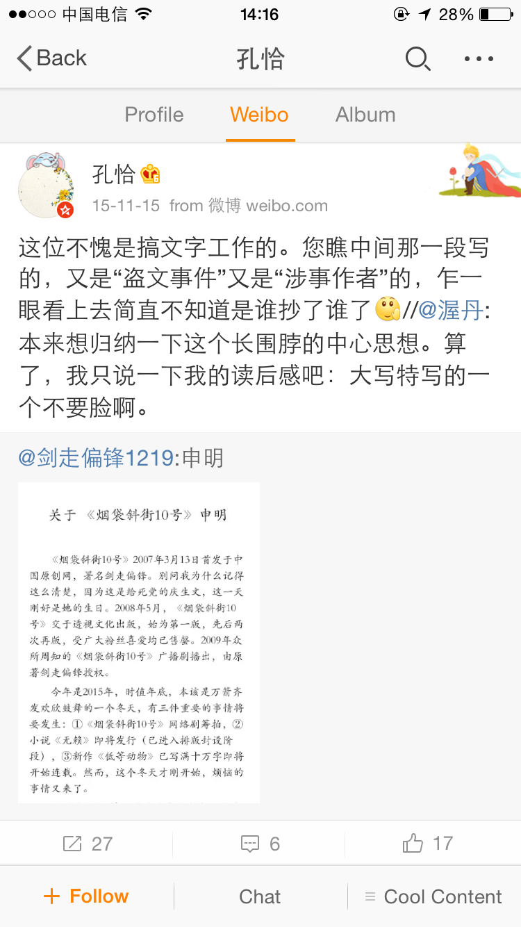 亏得我还以为她是一个对抄袭深恶痛绝,并且很有原则的人……考虑到摸鱼组是孔恰朋友脉脉(渥丹)的私人作坊,要求孔恰将摸鱼组钉在抄袭耻辱柱上似乎有些不人道,但我看到她依旧很欢快地转发摸鱼组的微博,好似抄袭之事从未存在过时,