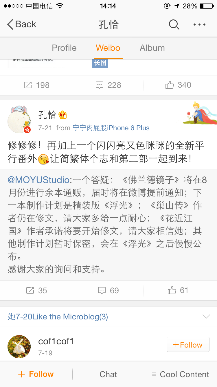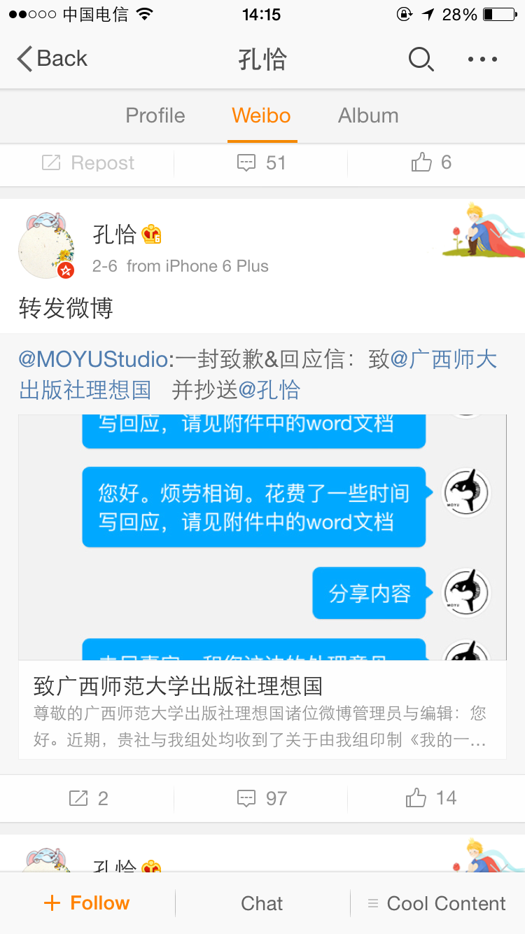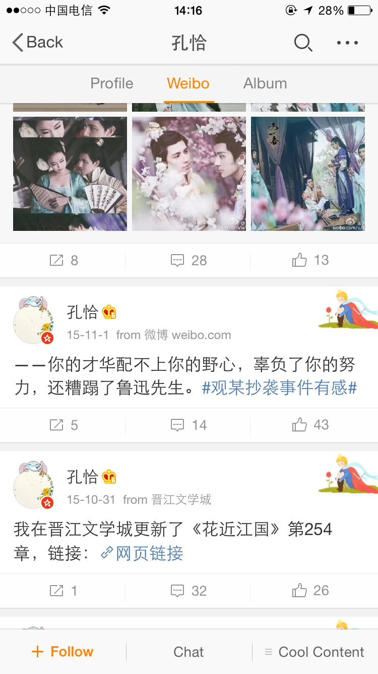 亏得我还以为她是一个对抄袭深恶痛绝,并且很有原则的人……考虑到摸鱼组是孔恰朋友脉脉(渥丹)的私人作坊,要求孔恰将摸鱼组钉在抄袭耻辱柱上似乎有些不人道,但我看到她依旧很欢快地转发摸鱼组的微博,好似抄袭之事从未存在过时,