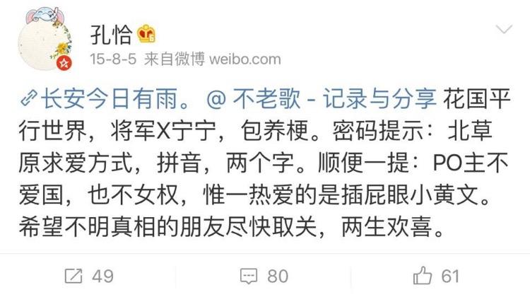 我关注孔恰很久了,她是一个耽美写手,如果讨论到她的文,在网上搜索的话,几乎是没有什么负面评价的。