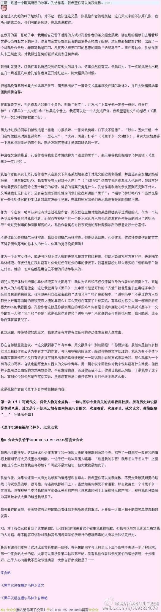 于是直到文里的读者找来开贴,希望孔恰道歉时,论坛里的人才知道,这篇飘红的“自荐文”其实是一篇黑文,而孔恰作为一个作者,不但没有正确对待她的读者,甚至没有正确对待她的笔下产物——我不知道写作的目的究竟是为了什么,但必然不是为了这份卑鄙,无论作者的文笔好坏,成就高低。