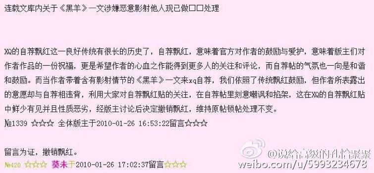 写了这篇影射文后,她还到论坛来自荐。当时自荐很多都是小透明,自荐是她们招徕大量读者的一个通道,所以符合要求的自荐帖版主是要飘红的。