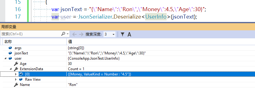 为了演示这种特殊的处理,我们声明了一个实体对象 UserInfo,并构造了一个 JSON 源,该 JSON 源包含了一个 UserInfo 不存在的属性:Money,预期该 Money 属性将被反序列化到属性 ExtensionData 中。