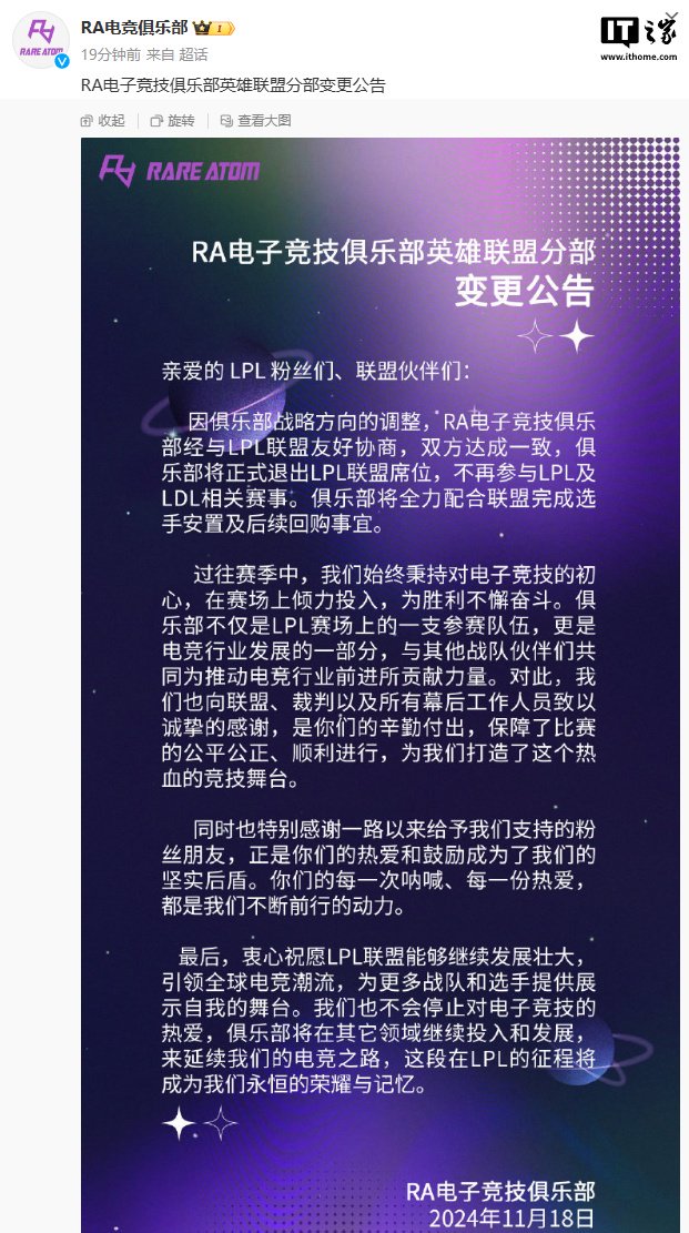IT之家 11 月 18 日消息,RA 电子竞技俱乐部今日发布官方公告:因俱乐部战略方向的调整,RA 电子竞技俱乐部经与 LPL 联盟友好协商,
