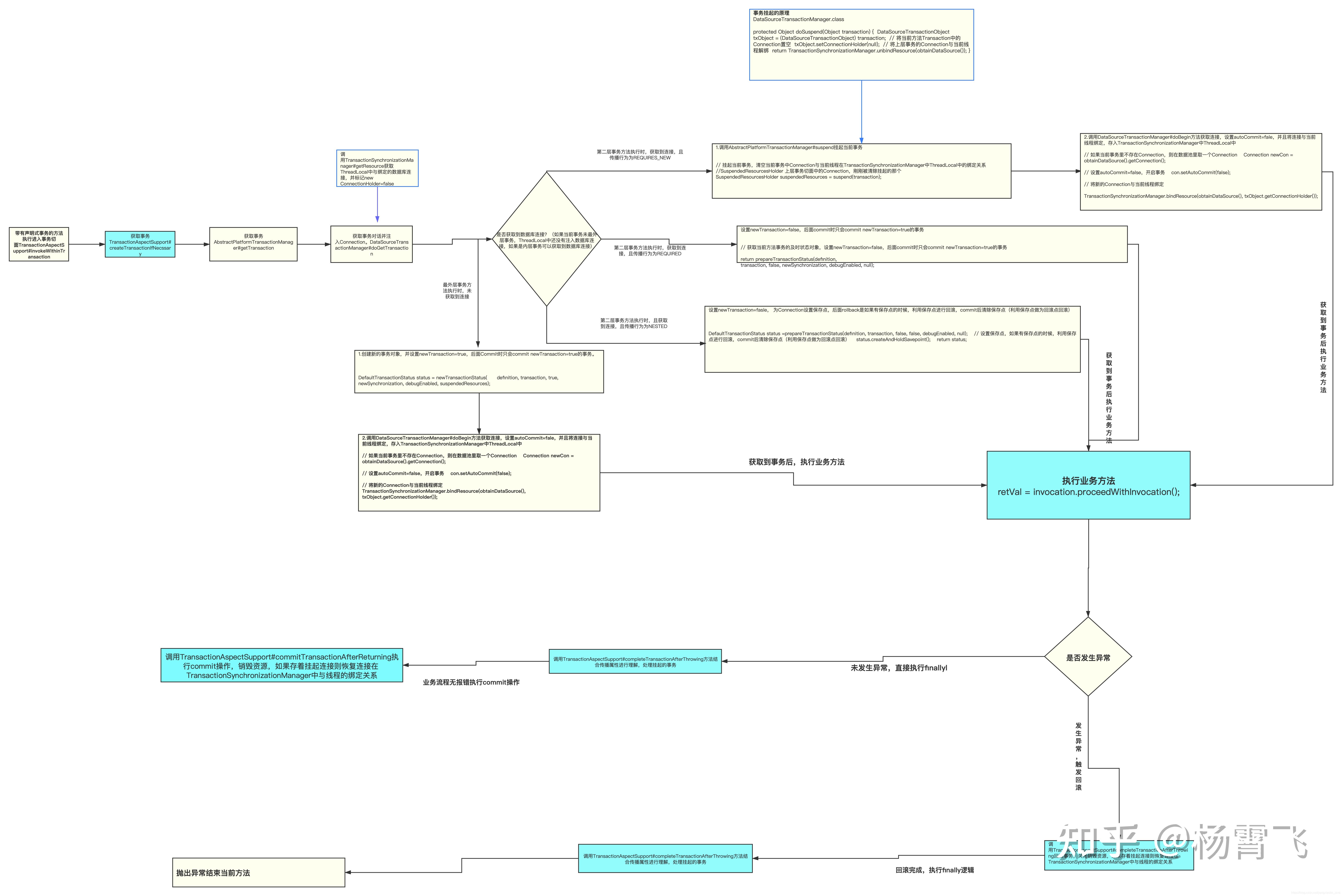 注:spring事务这块源码建议大家先看流程图,虽然原理简单但是调用栈特别深,贴代码讲解很容易看懵了(spring的事务处理流程请参考-- spring事务源码剖析 )。