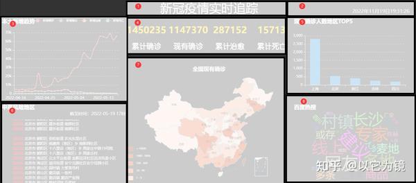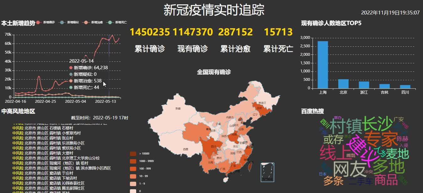 前面文章在前端部署知识图谱中,用到了Flask框架,便入坑。本文仍主要基于Flask,利用疫情数据搭建可视化大屏,供加深印象学习。我们要达到的可视化大屏效果如下: