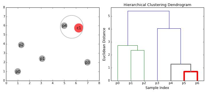 在single linkage 层次聚类中,两个聚类之间的距离是通过在属于每个聚类中的两个点的最短的距离来定义的。例如,聚类”r” 和”s”之间的距离等于图上面两个最近点之间的距离,即那个箭头的长度。