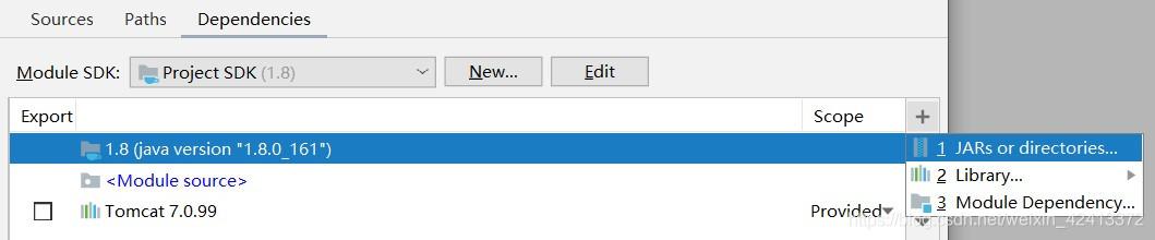 11.修改好后,再点旁边的Dependencies,点击"+"号,选择1 JARs or directories。