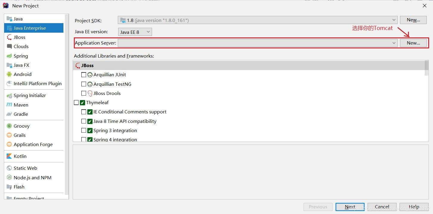 2.选择Java Enterprise,Application Server项点击选择你使用的Tomcat。