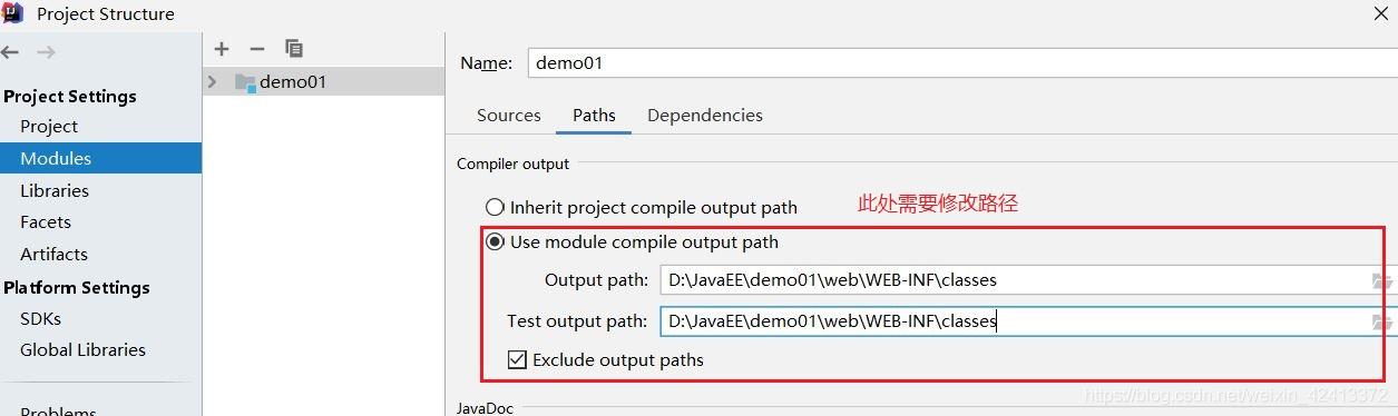 10.点击Modules ,选择Paths,选中Use module compile output path ,把路径改成刚刚创建的classes文件夹。