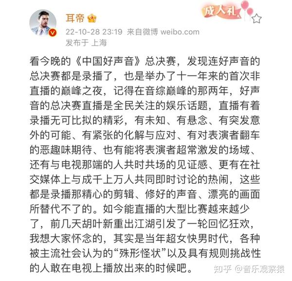 第四,来看看总决赛的录制形式变化。 熟悉节目的观众一定知道,从第一季到去年的第十季,都是采用现场直播方式在浙江卫视和网络端播出。而今年(2022年)的总决赛彻底放弃直播,第一次采用录播,即:总决赛在10月14号录制,28号才播出。其中原因笔者并不了解,但极有可能是众所周知的原因,也有可能是出于防疫需要。笔者在此引用乐评人耳帝对此的评价,不做额外分析: