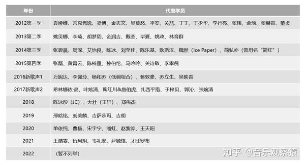 可以看出,节目前几季(尤其是第一季和第三季)涌现了一大批凭借自身实力在行业内扎根、逐渐被大众熟知的优秀学员,包括袁娅维、吉克隽逸、张碧晨、周深、黄霄云这样的中坚力量,但之后便呈减少趋势。虽然也出现过2020年单依纯这样实力、唱商与颜值均在线的歌手,但已是凤毛麟角。也正因为单依纯这样的“救星”出现,以及《永不失联的爱》等多首歌曲的破圈,才使得节目在当年的口碑有所回升。
